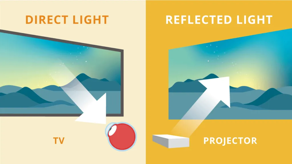پروژکتورها میتوانند برای چشمها راحتتر باشند، زیرا نور را از روی صفحه بازتاب میدهند، نه اینکه مستقیم مثل تلویزیون به چشم بتابانند. این نور بازتابی ملایمتر است، بهویژه در محیطهای تاریک، و میتواند خستگی چشم در جلسات طولانی تماشا را کاهش دهد. در مقابل، هنگام استفاده از تلویزیون میتوان با نورپردازی مناسب محیط، روشنایی سالم و مناسبی برای چشمها حفظ کرد.