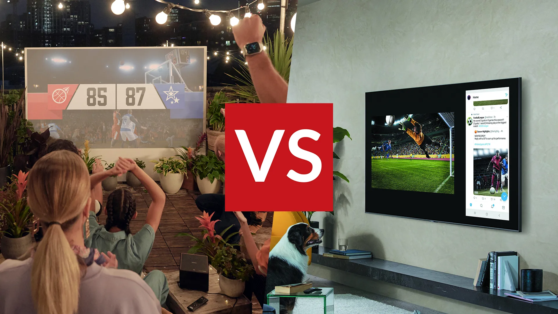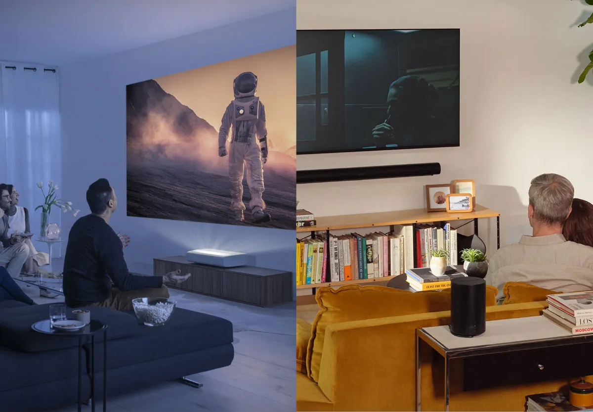 در مورد تلویزیونها، آنها به دلیل کیفیت بالای صدا و قابلیت استفادهی 24 ساعته انتخاب بهتری محسوب میشوند. با این حال، در مقایسه با پروژکتورها نمایشگر کوچکتری دارند و قابلیت جابهجایی و حمل آسان را نیز ارائه نمیدهند.