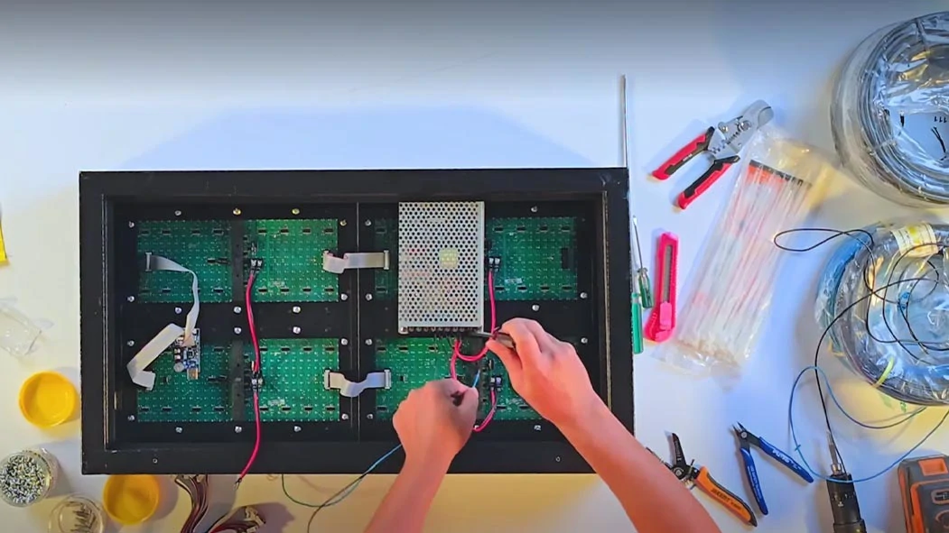 بعد از بستن پیچ ها و فیکس کردن ماژول ها به قاب فلزی، کابل های فلت و کابل برق وصل می شوند.