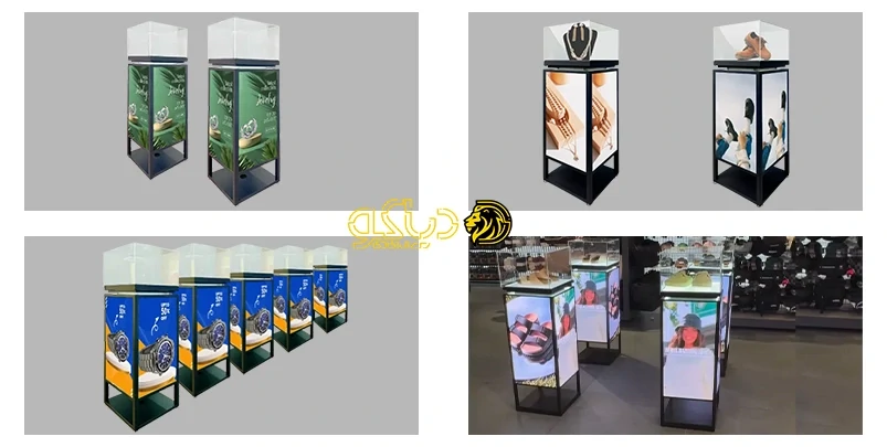 داخل محفظه شفاف می توان، محصول واقعی مانند (کفش، ساعت، موبایل، عطر، اکسسوری و غیره) قرار داد و همزمان روی بدنه led ویدئو، تصویر یا تبلیغاتی مربوط به همان محصول را نمایش دهید.
