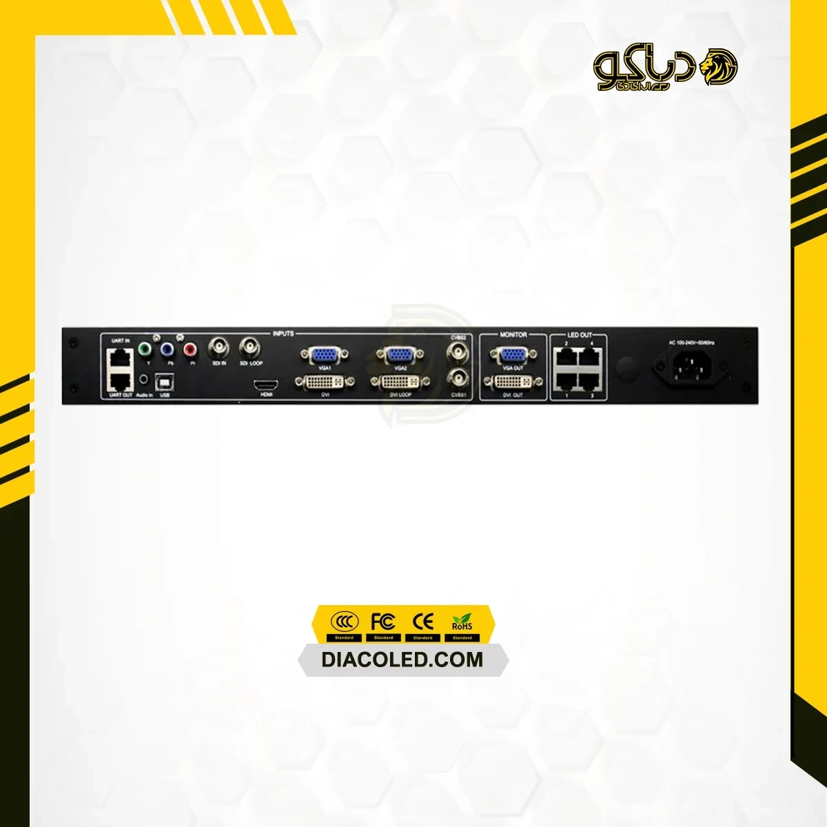 9 پورت (دو عدد VGI، دو عدد CVBS ، یک عدد HDMI، یک عدد USB، یک عدد SDI و یک عدد YPbPr و یک خروجی صدا AUDIO)